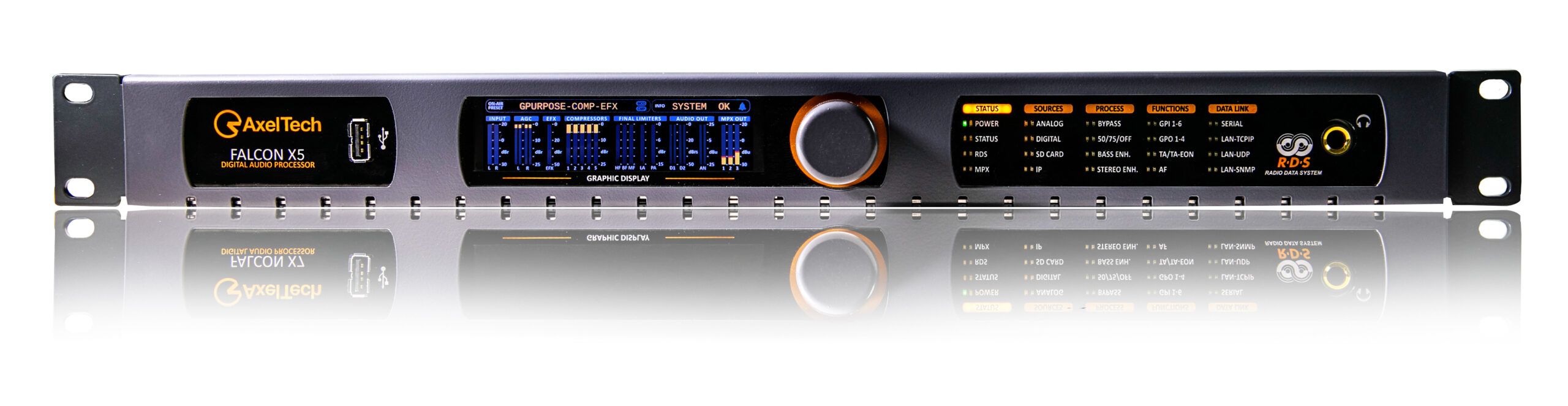 Falcon X5, known for its quality and reliability, empowers broadcast engineers to create a perfect sound identity. With presets tailored to their style or customized settings, they can achieve high sound quality effortlessly. The unit features a 5 Bands Audio Processor, MPX Generator, and optional RDS Encoder, providing versatility for FM and digital broadcasting. Its customizable audio processing tools and extensive preset options allow for precise control over sound parameters.
