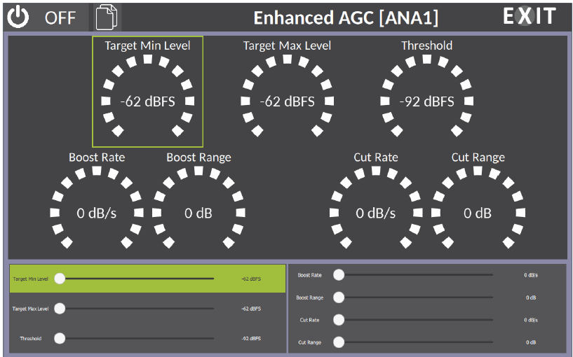Through carefully adjusted parameters, such as the ‘target min level’ and ‘target max level,’ the AGC effectively manages signal gain, ensuring optimal audio quality. Signals exceeding the threshold defined by the AGC settings will be precisely controlled, providing enhanced audio performance